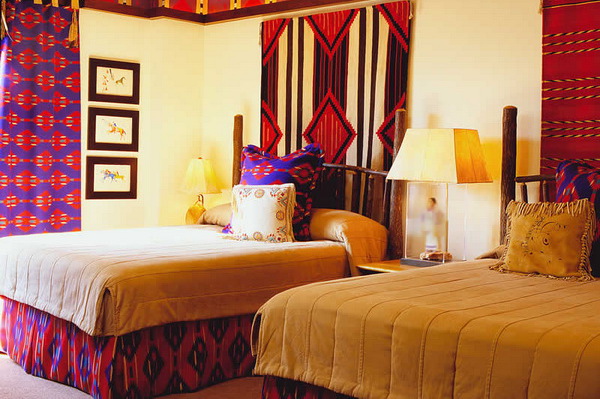 Также здесь в обязательном порядке необходимо использовать набивные варианты тканей, на которые нанесен яркий орнамент в цветочном мотиве, или с животными, птицами. Такие ткани применяют в качестве покрывал, чехлов на подушки, штор и занавесок и т. п.