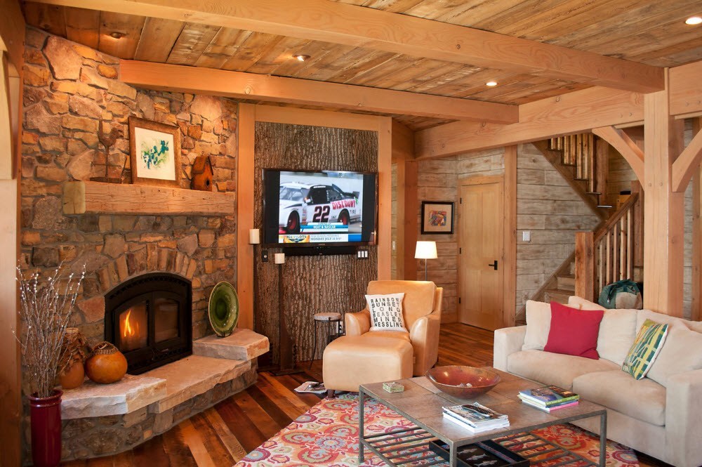 В гостиной можно монтировать балки по типу решетки или елочки. Даже на чердаке данное оформление может сделать из невзрачного помещения уютную комнату. Поэтому среди дизайнерских решений очень распространена отделка чердачных помещений по такому типу.