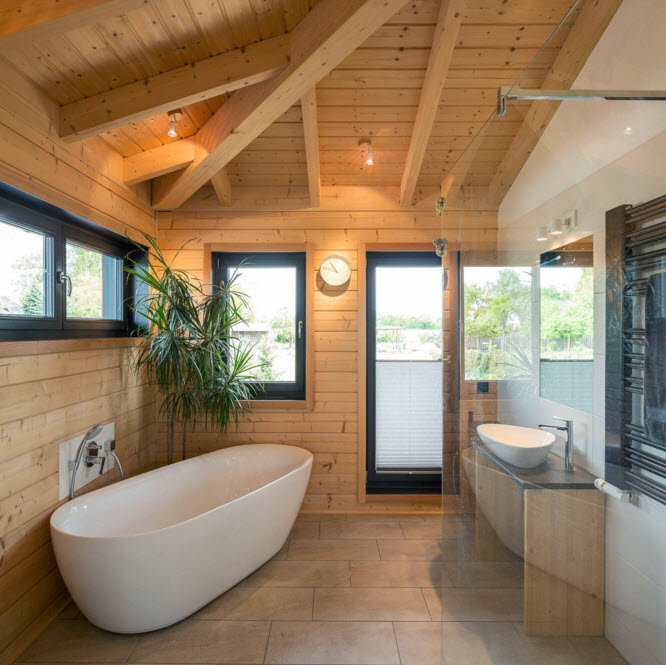 Оформление потолка в ванной балками из дерева: необычный дизайнерский прием