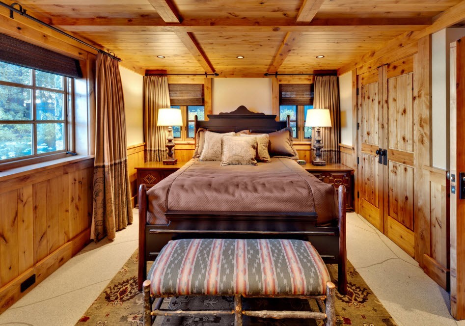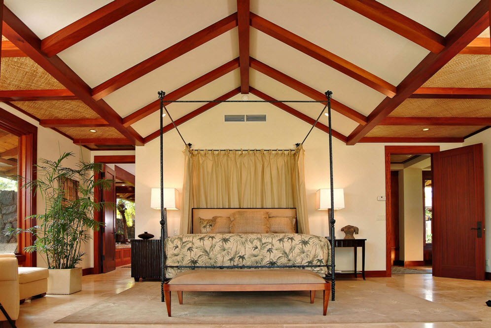 Многим может показаться абсурдом использование каких-то массивных конструкций на потолке в спальне, ведь это комната предназначена для отдыха. Но, как показывает практика, все зависит от выбранного стиля: кантри и прованс редко бывают без деревянных деталей в интерьере. Так почему дерево нельзя применить на потолке? Вовсе необязательно выбирать контрастные и тяжелые элементы, это может быть светлое дерево или обычная покраска. Но при высоких потолках и темные балки на белом потолке выглядят довольно привлекательно, особенно, если им компонируют некоторые предметы мебели.