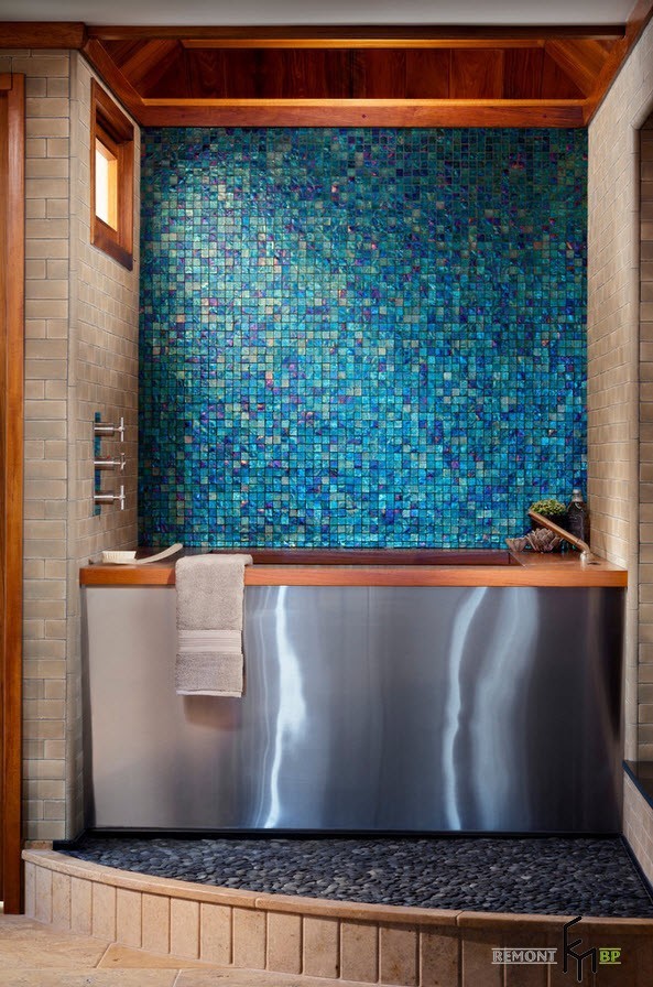 Яркие голубые, лазурные и синие оттенки мозаичной плитки пользуются особой популярностью. Неудивительно, что в помещении для водных процедур нам хочется отражения синевы океана или лазурности небесного отражения в воде, успешно интегрированного в интерьер помещения.