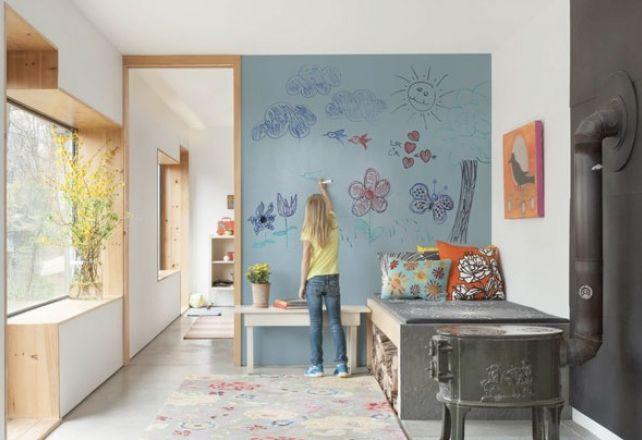Грифельная краска превращает помещение в огромный школьный класс — на такой поверхности очень удобно писать мелками.