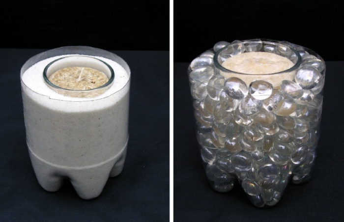 Выглядит очень пристойно такой подсвечник. При аккуратно выполненной работе разглядеть и понять, что это именно пластиковая тара очень сложно.