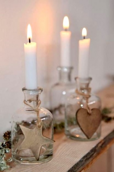 Самым простым вариантом создания подсвечника может стать красивая стеклянная бутылка необычной формы или бокал. Их можно задекорировать росписью витражными красками, красивыми материалами, сухими фруктами, палочками корицы, тесьмой, корой дерева и так далее.