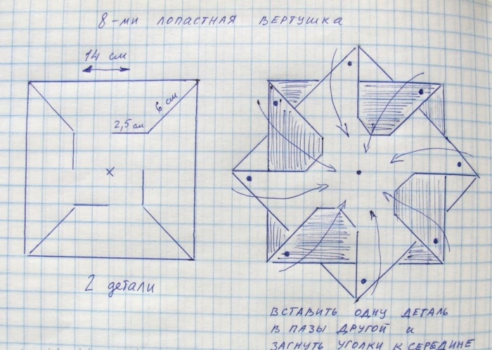 Для формирования игрушки можно использовать однотонную или цветную бумагу, второй вариант позволит сделать более привлекательный экземпляр. Немного сложнее выглядит схема 8-ми лопастной конструкции, но это только кажется на первый взгляд: