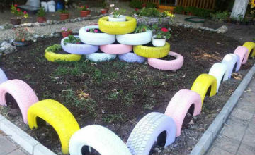 К примеру, чтобы изготовить клумбу из автомобильной покрышки, не нужно особо гадать. Просто берется бу шина, засыпается землей. Но это не будет шедевром. Вот если взять краски, разукрасить шину с внешней стороны, а еще лучше – поставить штуки три колеса – одно на одно – вот тогда получится настоящий шедевр.