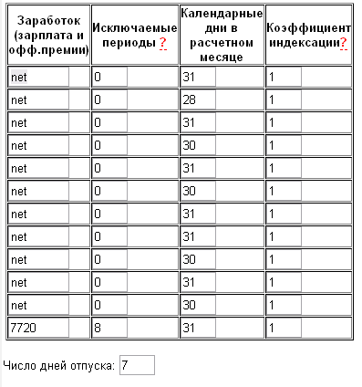 Расчет отработанных днейСредний заработок за месяц0 (календарные дни) — 0 (исключаемые дни) = 0 дн.net (заработок) / 29,3 * 0 (календарные дни) * 1 (коэффициент индексации) = 0 руб.28 (календарные дни) — 0 (исключаемые дни) = 28 дн.10000 (заработок) / 29,3 * 28 (календарные дни) * 1 (коэффициент индексации) = 9556.31 руб.31 (календарные дни) — 0 (исключаемые дни) = 31 дн.10000 (заработок) / 29,3 * 31 (календарные дни) * 1 (коэффициент индексации) = 10580.2 руб.30 (календарные дни) — 0 (исключаемые дни) = 30 дн.10000 (заработок) / 29,3 * 30 (календарные дни) * 1 (коэффициент индексации) = 10238.91 руб.31 (календарные дни) — 0 (исключаемые дни) = 31 дн.10000 (заработок) / 29,3 * 31 (календарные дни) * 1 (коэффициент индексации) = 10580.2 руб.30 (календарные дни) — 0 (исключаемые дни) = 30 дн.10000 (заработок) / 29,3 * 30 (календарные дни) * 1 (коэффициент индексации) = 10238.91 руб.31 (календарные дни) — 0 (исключаемые дни) = 31 дн.10000 (заработок) / 29,3 * 31 (календарные дни) * 1 (коэффициент индексации) = 10580.2 руб.31 (календарные дни) — 0 (исключаемые дни) = 31 дн.10000 (заработок) / 29,3 * 31 (календарные дни) * 1 (коэффициент индексации) = 10580.2 руб.30 (календарные дни) — 0 (исключаемые дни) = 30 дн.10000 (заработок) / 29,3 * 30 (календарные дни) * 1 (коэффициент индексации) = 10238.91 руб.31 (календарные дни) — 0 (исключаемые дни) = 31 дн.10000 (заработок) / 29,3 * 31 (календарные дни) * 1 (коэффициент индексации) = 10580.2 руб.30 (календарные дни) — 0 (исключаемые дни) = 30 дн.10000 (заработок) / 29,3 * 30 (календарные дни) * 1 (коэффициент индексации) = 10238.91 руб.31 (календарные дни) — 0 (исключаемые дни) = 31 дн.10000 (заработок) / 29,3 * 31 (календарные дни) * 1 (коэффициент индексации) = 10580.2 руб.Итого дней: 0 + 28 + 31 + 30 + 31 + 30 + 31 + 31 + 30 + 31 + 30 + 31 = 334 сумма расчетных днейИтого заработка: 0 + 9556.31 + 10580.2 + 10238.91 + 10580.2 + 10238.91 + 10580.2 + 10580.2 + 10238.91 + 10580.2 + 10238.91 + 10580.2 = 113993.17 сумма заработка