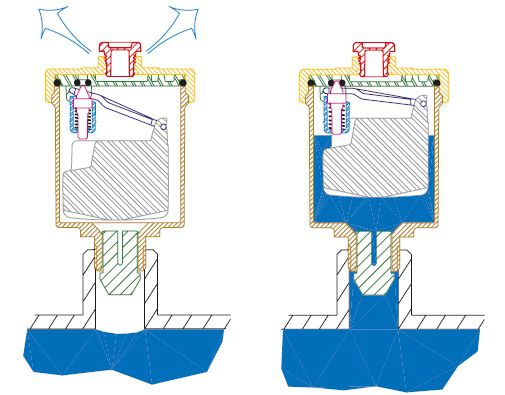 Воздушная пробка вытесняет теплоноситель, что в свою очередь приводит к ослаблению поплавка и открытию сбросного отверстия, через которое воздух выходит в атмосферу. При этом уровень теплоносителя повышается, жидкость занимает освободившийся объем и возвращает поплавок на место, вновь запирая сбросное отверстие.