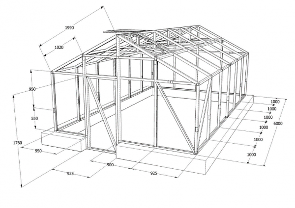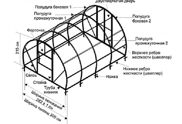 Чертеж тепличной постройки с размерами, приведенный ниже, наглядно демонстрирует конструктивные элементы, входящие в её состав и придающие необходимую жесткость законченному сооружению.