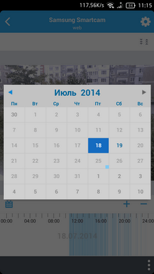 Просмотр архива, если таковой велся, возможен за любую дату. Нужное число выбирается в календаре, всплывающем по нажатию соответствующей кнопки на таймлинии. Отметки о записи событий загружаются за весь день целиком, и отображаются на таймлинии в виде знакомых синих отрезков.