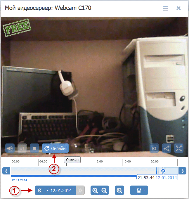 Чтобы в дальнейшем смотреть видеозаписи за другие дни, необходимо будет нажать кнопку “Календарь” (1) – выбрать день – на шкале времени выбрать нужный час. А чтобы при просмотре архива вернуться к онлайн-съемке – нужно нажать кнопку “Онлайн” (2).