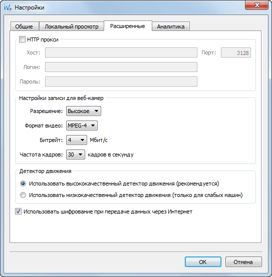 Теперь жмем кнопку с ключом “Настройки”. Если перейти во вкладку “Расширенные”, то здесь можно задать настройки записи для веб-камеры. Кстати они влияют на объем данных, записываемых в архив (подробнее ).