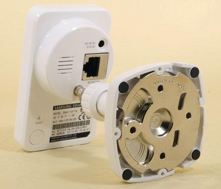На задней части корпуса, на округлом выступе, расположен вход адаптера питания, LAN-порт для подключения кабеля локальной сети, и внутренний динамик-пищалка. Шаровое крепление с резьбовым зажимом позволяет повернуть и зафиксировать камеру под любым углом вверх и вокруг оси подставки.