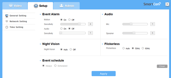 Да, кстати, детектор. Чувствительность детектора движения и звука, как и прочие параметры камеры, задается во вкладке с настройками. Здесь можно включить либо отключить функцию ночного видения, настроить чувствительность микрофона и громкость динамика, выставить системную частоту во избежание мерцания при съемке (почти во всем мире частота в электросети составляет 50 Гц, исключением являются лишь некоторые страны).