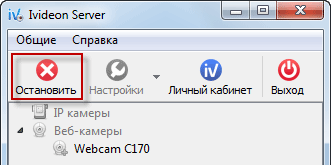 Теперь осталось кое-что донастроить в программе Ivideon Server. Она у нас сейчас запущена и работает. Чтобы попасть в настройки, сначала остановим ее: