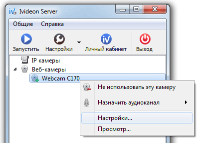 Теперь идем в настройки веб-камеры. В главном окне программы щелкаем правой клавишей мыши по названию камеры – выбираем “Настройки”: