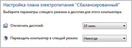 Также необходимо сделать следующее: отключаем спящий режим компьютера. В Windows 7 для этого необходимо зайти в “Пуск” – “Панель управления” – “Электропитание”. Слева выбираем “Настройка перехода в спящий режим”. В строке “Переводить компьютер в спящий режим” выбираем “Никогда”. В строке “Отключать дисплей” можно выбрать что угодно: