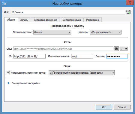 Помимо настроек подключения, здесь имеется возможность изменить такие установки, как локальное расположение видеоархива, чувствительность детектора движения и звука, расписание принудительной записи.