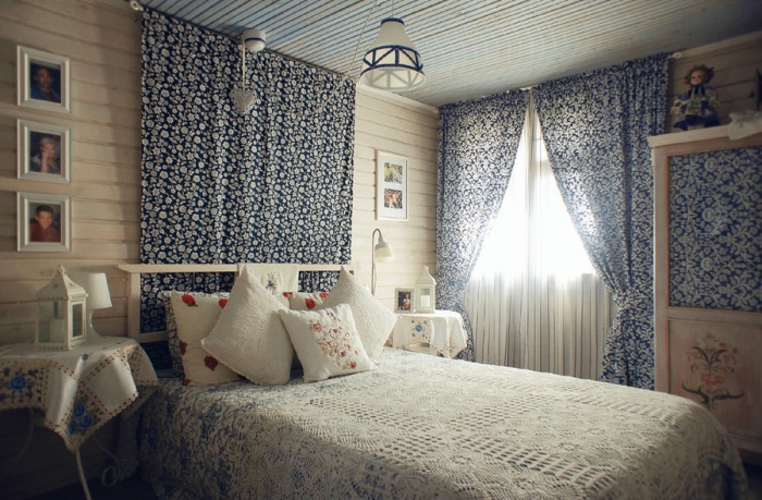 Он имеет немало разновидностей и может, к примеру, быть английским, французским или скандинавским. Подобные направления предполагают отделку поверхностей простыми материалами светлых оттенков и использование невычурной деревянной мебели. Сделать спальню более уютной помогут изящные орнаменты и милые текстильные детали, например, покрывала, изготовленные в технике пэчворк.