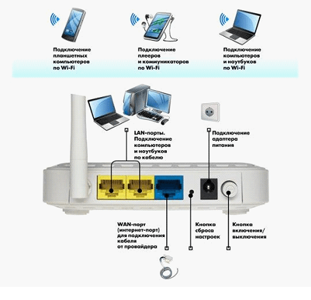 В WAN-порт маршрутизатора вставить кабель от провайдера. Через разъемы LAN подключить компьютеры с помощью патч-кордов. Ввести параметры провайдера через веб-интерфейс, запускаемый в браузере компьютера, введя адрес, написанный в руководстве по эксплуатации маршрутизатора (обычно 192.168.1.1).