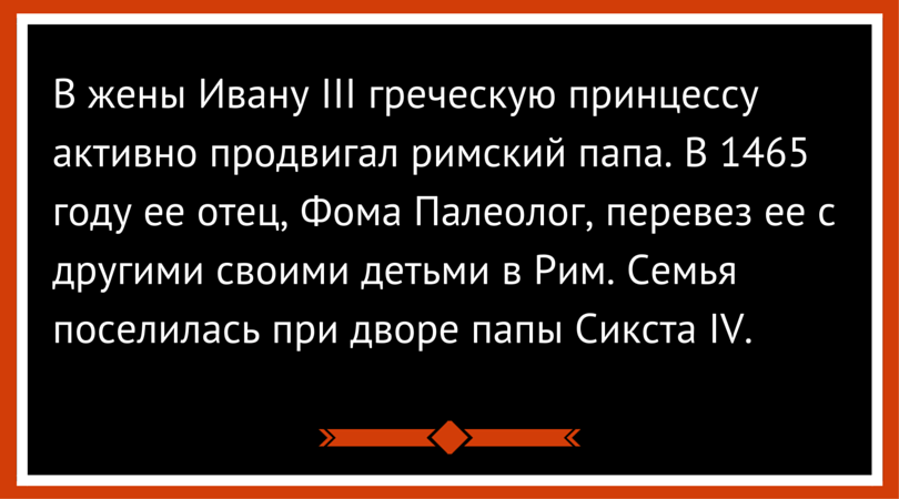 Как известно, в жены Ивану III греческую принцессу активно продвигал римский папа Павел II. В 1465 году ее отец, Фома Палеолог, перевез ее с другими своими детьми в Рим. Семья поселилась при дворе папы Сикста IV.