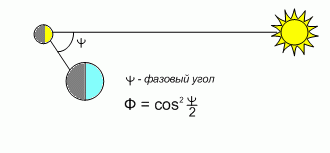 Фаза – это отношение площади освещенной части диска небесного тела к площади всего диска. В фазе новолуния Ф = 0,0, в фазе первой и последней четвертей = 0,5, в фазе полнолуния = 1,0.