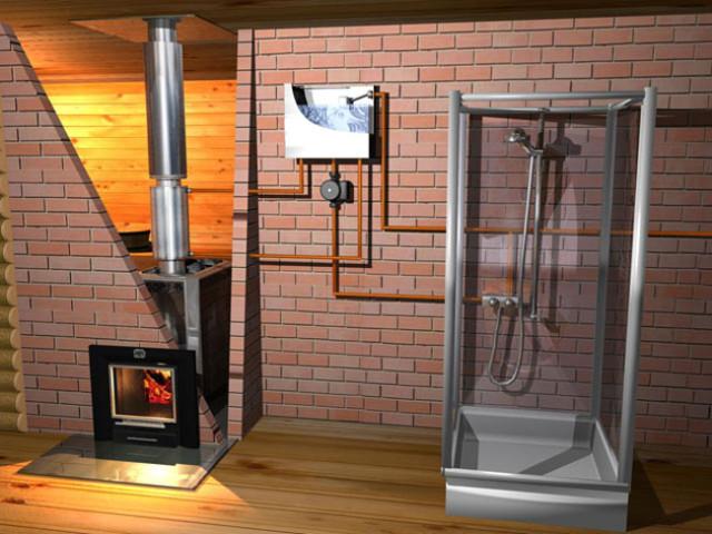 Для организации снабжения бани горячей водой, а также для отопления помещений используют печи, оснащенные системами принудительной циркуляции горячей воды, а также теплообменниками.