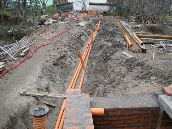 При таких работах требуется учитывать прохождение грунтовых вод, чтобы трубы не оказались в воде. Трубопровод в обязательном порядке надо утеплить. Сверху надеть гофру или трубу большего диаметра.