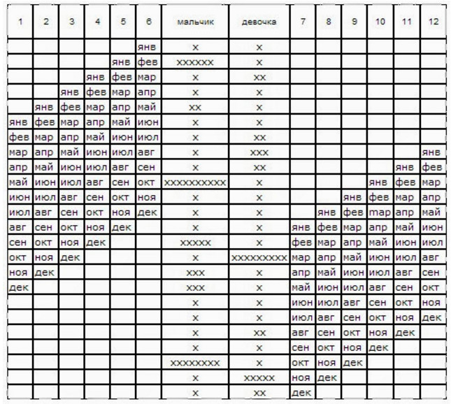 Лунный возрастМесяц, в который был зачат ребенок12345678910111218ДМДМММММММММ19МДМДММММММДД20ДМДМММММДМММ21МДДДДДДДДДДД22ДММДМДДМДДДД23ММДММДМДМММД24МДММДММДДДДД25ДММДДМДДММММ26МДМДДМДМДДДД27ДМДМДДММММДМ28МДМДДДММММДД29ДМДДММДММДДД30МДДДДДДДДДММ31МДМДДДДДДДММ32МДМДДДДДДДММ33ДМДМДДДМДДДМ34ДДМДДДДДДДММ35ММДМДДДМДДММ36ДММДМДДДММММ37МДММДМДМДМДМ38ДМДММДМДМДМД39МДМММДДМДМДД40ДМДМДММДМДМД