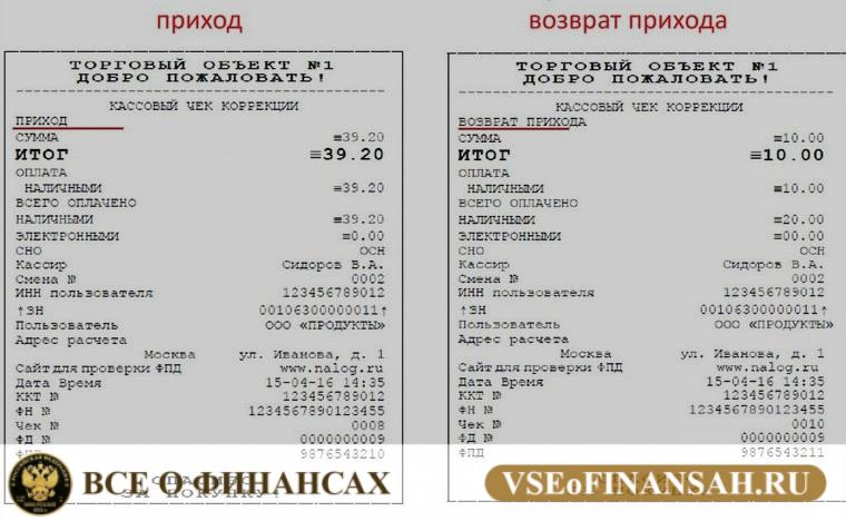 Необходимо сформировать чек по признаку «Возврат прихода ». Вот чем он отличается от обычного чека «Приход»: