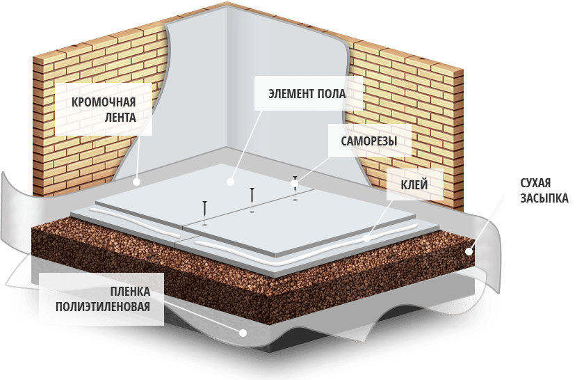 При монтаже сухой стяжки, поверх гидроизоляции высыпается слой мелкофракционног о керамзита. Керамзит выравнивается при помощи уровня и поверх засыпки укладываются листы ГВЛ, имеющие замки, которыми надежно скрепляются между собой шурупами и клеем. В итоге получается прочное и ровне покрытие.