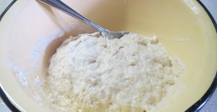 4. Начинаем понемножку добавлять муку. Всыпаем муку небольшими порциями и каждый раз размешиваем, чтобы не было комочков. Добавляем муку до нужной нам консистенции теста.