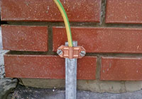В него вставляется или токопроводящая шина из металлической полосы, или же сразу кабель заземления сечением 25 кв. мм. Для соединения со стальной полосой предусмотрена специальная прокладка, которая не даёт возможности для электрохимического контакта между мелью стержня и сталью (цинком). В дальнейшем шина или кабель заводятся в дом и подключаются к распределительному щитку точно так же, как это было описано выше.