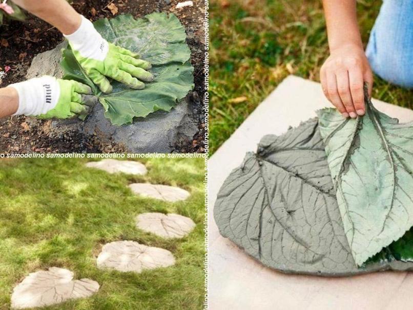 Оригинальную тропинку на даче можно обустроить, используя в качестве трафарета листья лопуха. Листья будут немного разные, что обеспечит индивидуальность каждого элемента.
