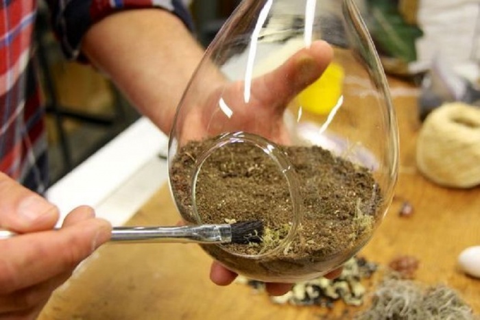 Почву необходимо полить, после чего можно приступать к посадке растений, корни которых предварительно тщательно очищаются от земли. Если флорариум создается в бутыли с узким горлом, для этого можно использовать пинцет, пластиковые ложки или вилки, ручки которых удлинены (например, палочками для суши или карандашами).