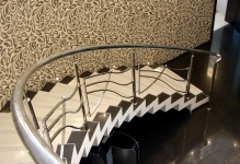 Также стоит сказать о способе соединений маршей. Самый привычный для нас вариант – это разворотные площадки. Однако нередко делают вместо площадок так называемые забежные ступени, вы их можете рассмотреть на левой стороне фотографии.