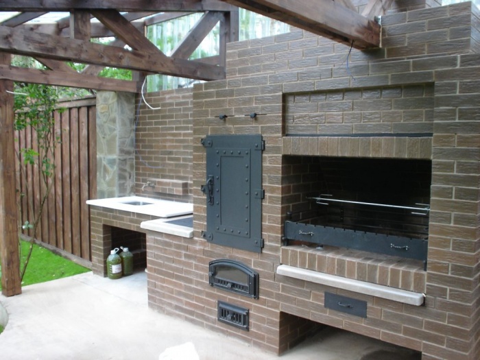 Не стоит строить самую простую конструкцию барбекю. В современное время существует множество идей, благодаря которым можно сделать многофункциональные барбекю с коптильней, складом для посуды и многим другим. На фото можно увидеть пример многофункционального барбекю с мангалом, коптильней и даже мойкой.