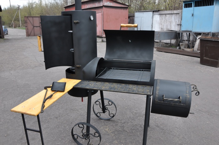 Эти установки меньше по размеру и функциональности, чем кирпичные, но дешевле и их можно переносить с места на место. Такая мангал коптильня оборудуется грилем и коптильной камерой горячего, а в некоторых конструкциях холодного копчения.