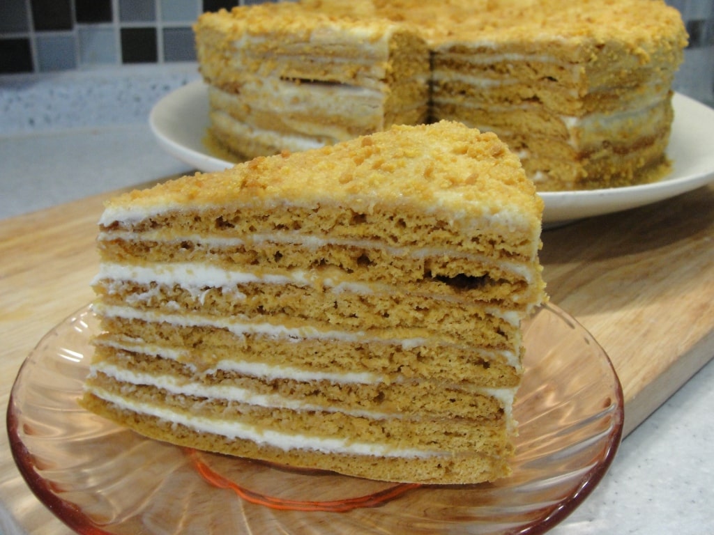 Ингредиенты: яйца — 3 шт., сливочное масло — 50 г, сахар — 600 г (по 300 г в тесто и крем), жидкий мед — 150 мл, сода — 1 ч. л., мука — 500 г, сметана — 500 г.
