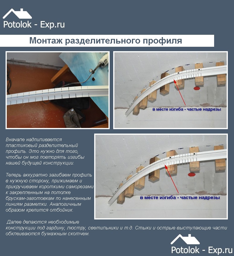 Изогнутые линии удобней всего чертить по прикладываемому к потолку пластиковому профилю. Он легко изгибается, сохраняя плавные переходы.