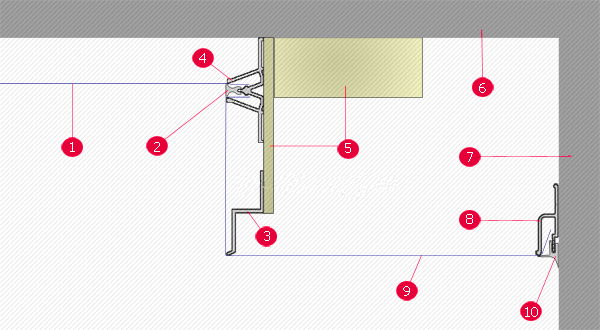 Схема 2. Конструкция многоуровневого натяжного потолка в разрезе (крепление типа ‘гарпун’): 1 — верхний уровень натяжной структуры; 2 — разделитель; 3 — заглушки разделителей; 4 — отбойник; 5 — базовый потолок; 6 — внутренний каркас; 7 — нижний уровень потолка; 8 — стеновой профиль, а также заглушка к нему; 9 — стены; 10 — декоративный плинтус.