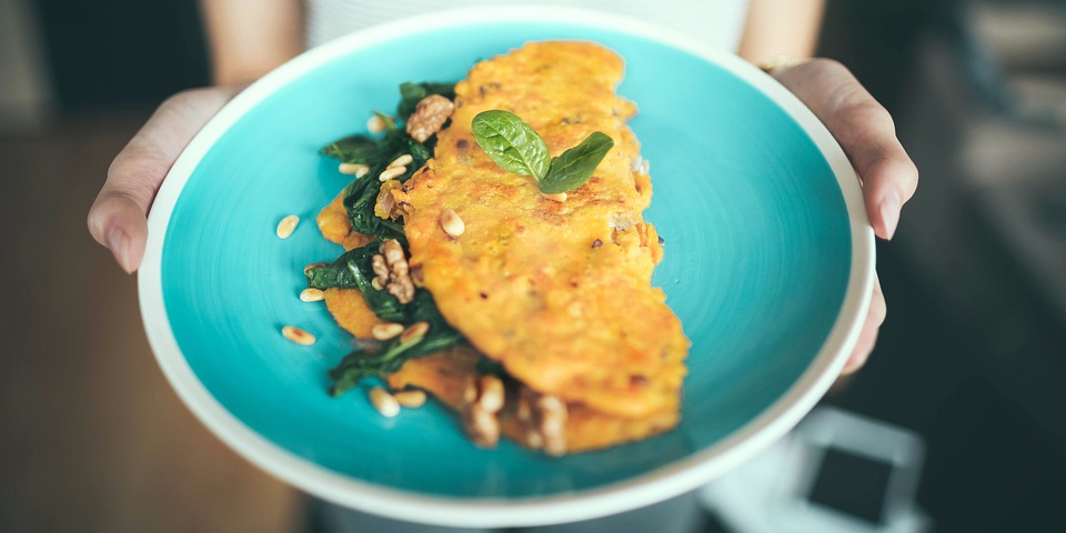 Обжарьте омлет до состояния, когда нижняя часть станет прочной, а верхняя — ещё не приготовится. На половину яичного блина выложите мытый шпинат, сыр, орехи. Накройте начинку второй половиной омлета и жарьте до готовности.