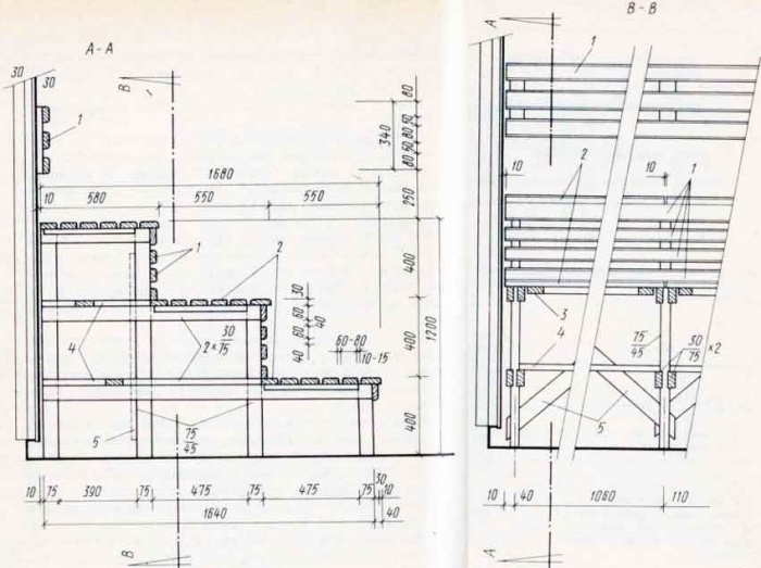 Поскольку полок периодически испытывает на себе перепады температуры и влажность, оптимальным материалом для его сооружения по стоимости и эксплуатационным качествам будет липа. Опоры можно сделать из сосны, а настил — только из липы. Определив высоту и ширину изделия, рисуем чертёж парной и выбираем оптимальную конфигурацию и расположение полка. Мы остановились на простой ступенчатой неширокой конструкции в два яруса. При необходимости можно будет доделать переносную лавку и использовать её как нижний ярус.