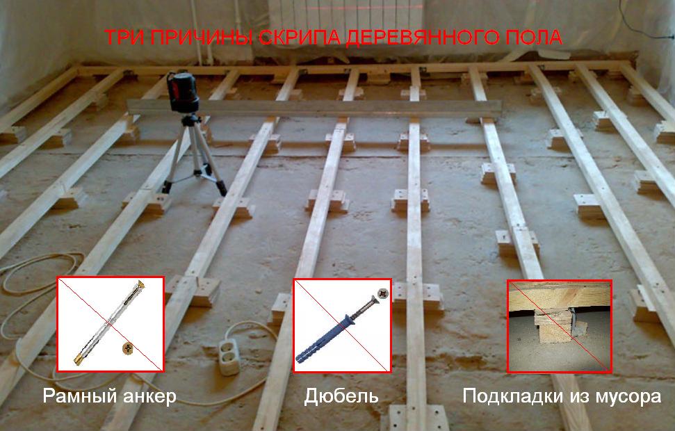 Важным этапом является установка лаг – они обязательно должны быть выставлены в уровень и надежно зафиксированы. Это обеспечит качество деревянного настила и срок его службы. Лаги можно регулировать при помощи деревянных или фанерных клиньев или подкладок на кирпичных или деревянных столбиках. Как советуют опытные мастера, лаги должны быть закреплены к основанию сквозь регулирующие подкладки.