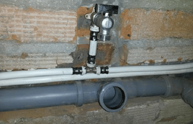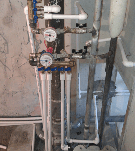Для прокладки пластикового водопровода с помощью перфоратора проштробим каналы в стенах ванной, туалета, кухни глубиной 2,5-3см. Далее необходимо спаять водопроводные трубы и подключить выводы к сливному бачку и умывальнику. В последнюю очередь установим и подключим водомеры на холодную и горячую воду к домашнему водопроводу.