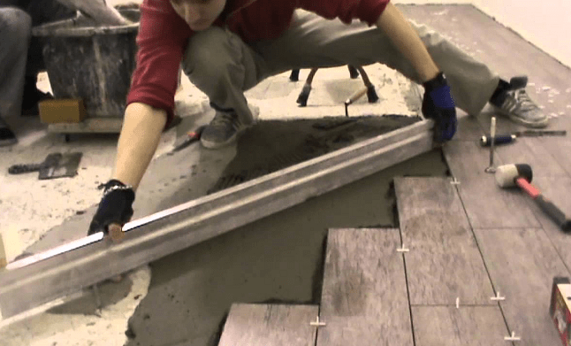 - Приготовьте рабочий цементно-песчаный раствор и уложите его на пол, растягивая правилом. Особое внимание уделите углам помещения.
