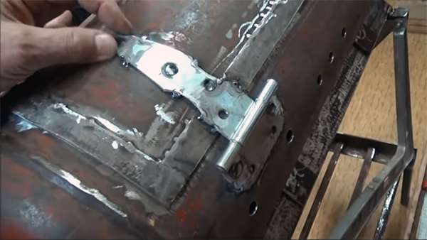 При выпиливании откидной крышки есть одна хитрость – сначала делают продольный рез стороны, где будут располагаться петли. Их лучше приварить сразу, таким образом, крышка будет установлена точно на своём месте. Тот же совет относится к креплению ручки – пока будущая крышка неподвижна, приварить кронштейны или изготовить отверстия под болты легче. Далее полностью выпиливают крышку по периметру. После того как откидная крышка сделана, прорезают пазы на глубину до 1 см для фиксации шампуров для шашлыка.