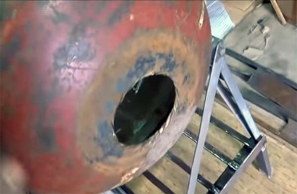 Аккуратно вырежьте вентиль и приварите отвод. Это будущий дымоход. С противоположного конца вырежьте отверстие для поддувала.