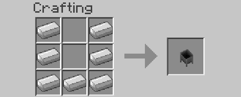 - Котел (Cauldron). Котел, вообще-то, не требуется для варки зелья, но вы можете держать в нем воду. В котле помещается ведро воды, которой хватит, чтобы заполнить три бутылки. Котел можно сделать, положив семь железных слитков в крайние клетки верстака, оставив верхние центральные и средние клетки пустыми.