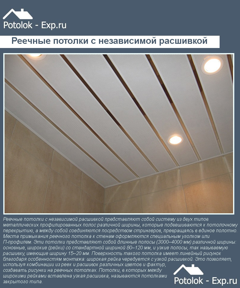 Потолки открытого типа собираются из реек, которые располагаются на определённом промежутке одна от другой, и не касаются друг друга. Просвет между ними иногда оставляется открытым, если это требуется стилем оформления. В другом, чаще используемом варианте, эти промежутки закрываются раскладками, и в итоге получается сплошная поверхность.